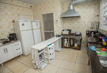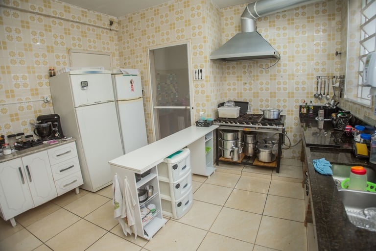 Espaço equipado com geladeiras dúplex, fogão, micro-ondas, forno elétrico e aparelhos eletrodomésticos (liquidificador centrifuga, batedeira, etc.). Toda na cor branca para facilitar a identificação da higiene.